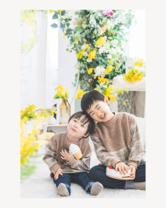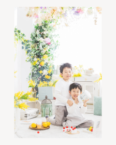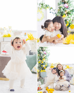 白いスタジオにミモザの可愛い黄色のセットが映え!